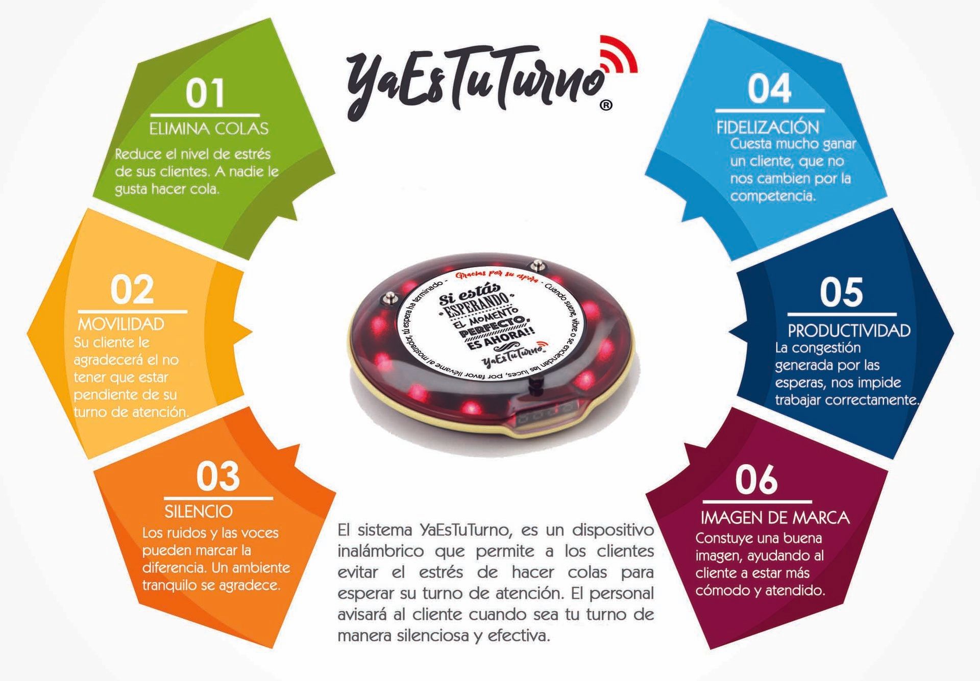 El sistema de Gestión de colas YaEsTuTurno, es un dispositivo inalámbrico que permite a sus clientes evitar el estrés de hacer colas para esperar ser atendidos, de esta forma el cliente será avisado a través de un receptor de señal en el momento que sea su turno de atención, ya sea por sonido, vibración y/o luces.